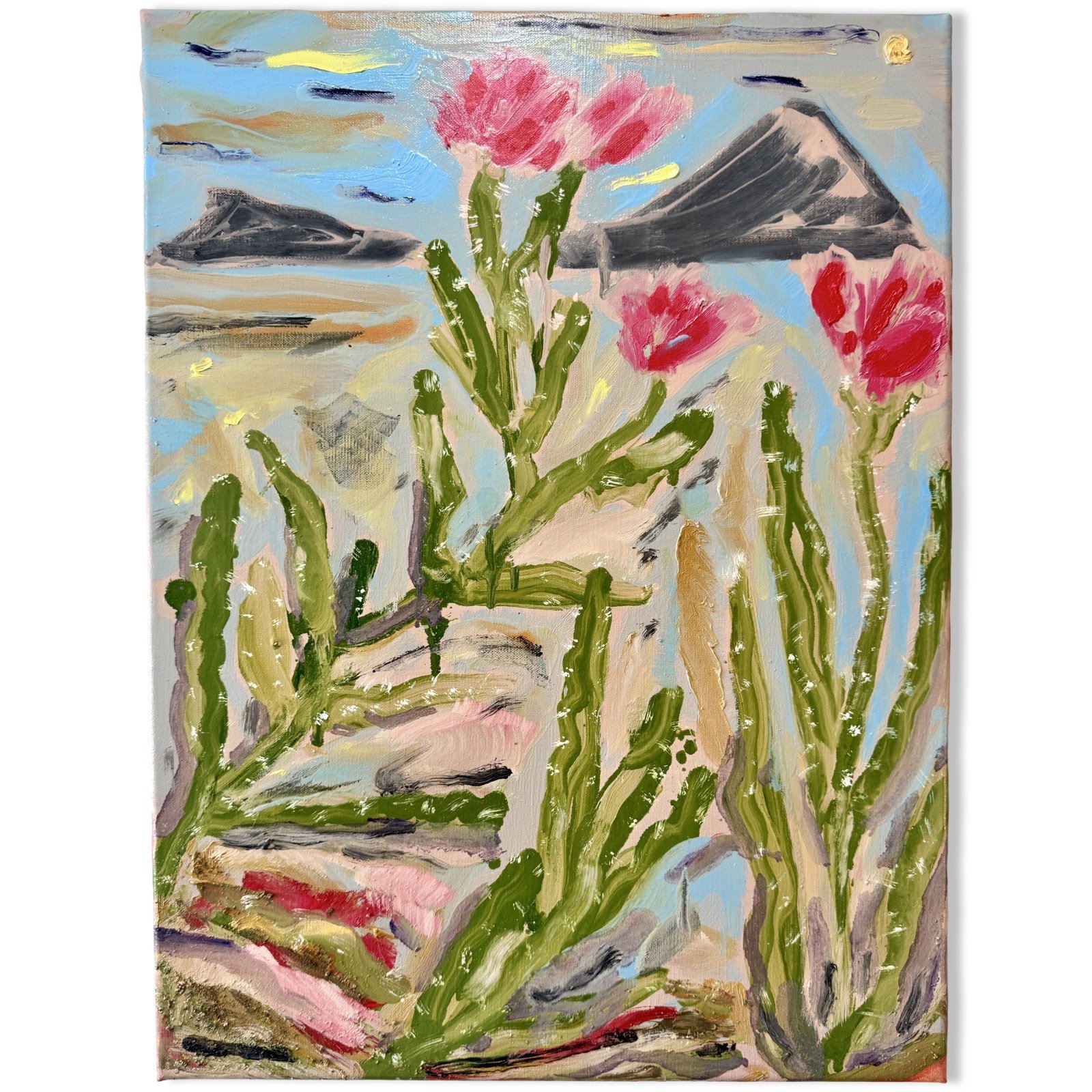 Painting of a cactus with pink flowers against a dark blue and purple background, with a yellow sun in the top left corner.